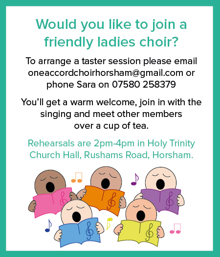 Come and join us! Arrange a free taster session by emailing oneaccordchoirhorsham@gmail.com.